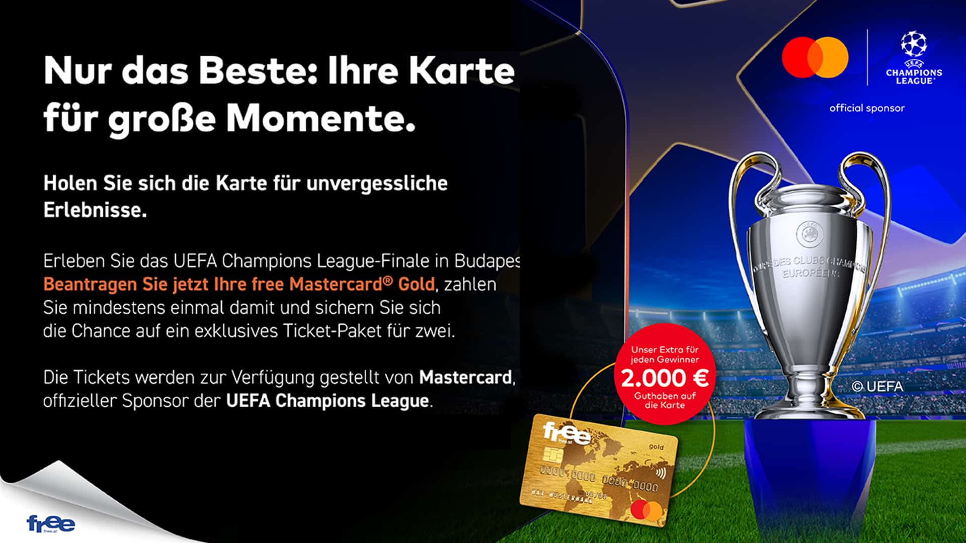 Mit der free Mastercard® Gold kann dieser Traum jetzt wahr werden: Wenn sie ihre Karte beantragt und mindestens einmal nutzt, hat sie die Chance auf ein exklusives Ticket-Paket für zwei Personen zum großen Finale in Budapest – inklusive Flug, Hotel und Transfers!